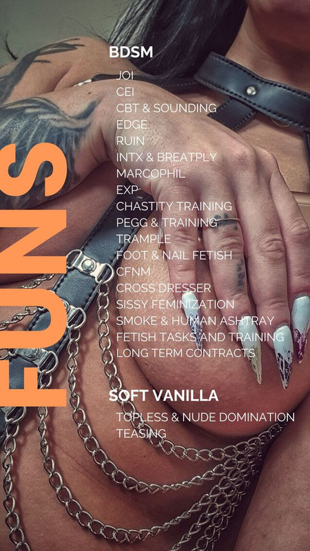 - brunette, leather, strapon, highboots, fastresponse, bdsm, findom, mistress, tattoos, femdom, smoke, tease, fetishes, training, longterm, softvanilla, prepayments, nakeddomme