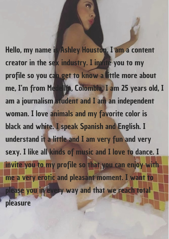 ⭐Ciao, Mi chiamo Ashley Houston, sono una creatrice di contenuti nel settore del sesso. Ti invito a visitare il mio profilo per conoscermi meglio. Vengo da Medellín, Colombia. Ho 25 anni, sono una studentessa di giornalismo e sono una donna indipendente. Amo gli animali, il mio colore preferito è il bianco e il nero. Parlo spagnolo e capisco un po' l'inglese, sono divertente e molto sexy, mi piace ogni genere di musica e adoro ballare.