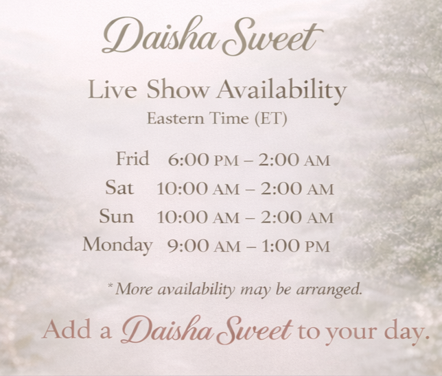 Puoi RICHIEDERE UN APPUNTAMENTO con Daisha Sweet quando ti è più comodo. Tutto è impostato sul tuo fuso orario e sulle tue ore locali. Lei riceverà la tua richiesta e la accetterà se la sua agenda è libera. Riceverai una conferma via email e potrai prepararti per la tua esperienza piccante.