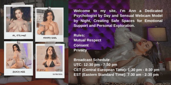 În prezent, sunt un model activ de cameră web; un explorator al erotismului meu, celebrând senzualitatea și expresia personală. Această fațetă a vieții mele îmi permite să mă conectez cu un public divers, oferind divertisment și companie într-un mediu sigur și consensual. Scopul meu este să creez un spațiu în care fiecare să se simtă liber să fie ei înșiși și să-și exploreze fanteziile fără rușine sau judecată morală.