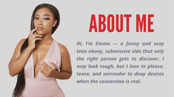 Olá, sou Emma — uma adolescente negra, divertida e sexy, com um lado submisso que só a pessoa certa consegue descobrir. Posso parecer durona, mas adoro agradar, provocar e me entregar a desejos profundos quando a conexão é real.