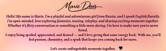 You can ASK FOR A DATE with MarieDevis at your convenience. Everything is in your timezone, your local hours. She will receive your request and accept it if her schedule is free. You will receive a confirmation via email and you can prepare for your hot experience.