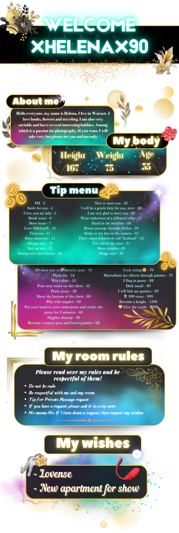 Вы можете ЗАПРОСИТЬ СТУДИЮ с XHelenaX90 в удобное для вас время. Всё будет по вашему часовому поясу и местному времени. Она получит ваш запрос и примет его, если её расписание будет свободно. Вы получите подтверждение по электронной почте и сможете подготовиться к вашему захватывающему опыту.