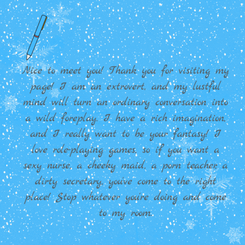 Nice to meet you! Thank you for visiting my page! I am an extrovert, and my lustful mind will turn an ordinary conversation into a wild foreplay. I have a rich imagination, and I really want to be your fantasy! I love role-playing games, so if you want a sexy nurse, a cheeky maid, a porn teacher, a dirty secretary, you've come to the right place! Stop whatever you're doing and come to my room.